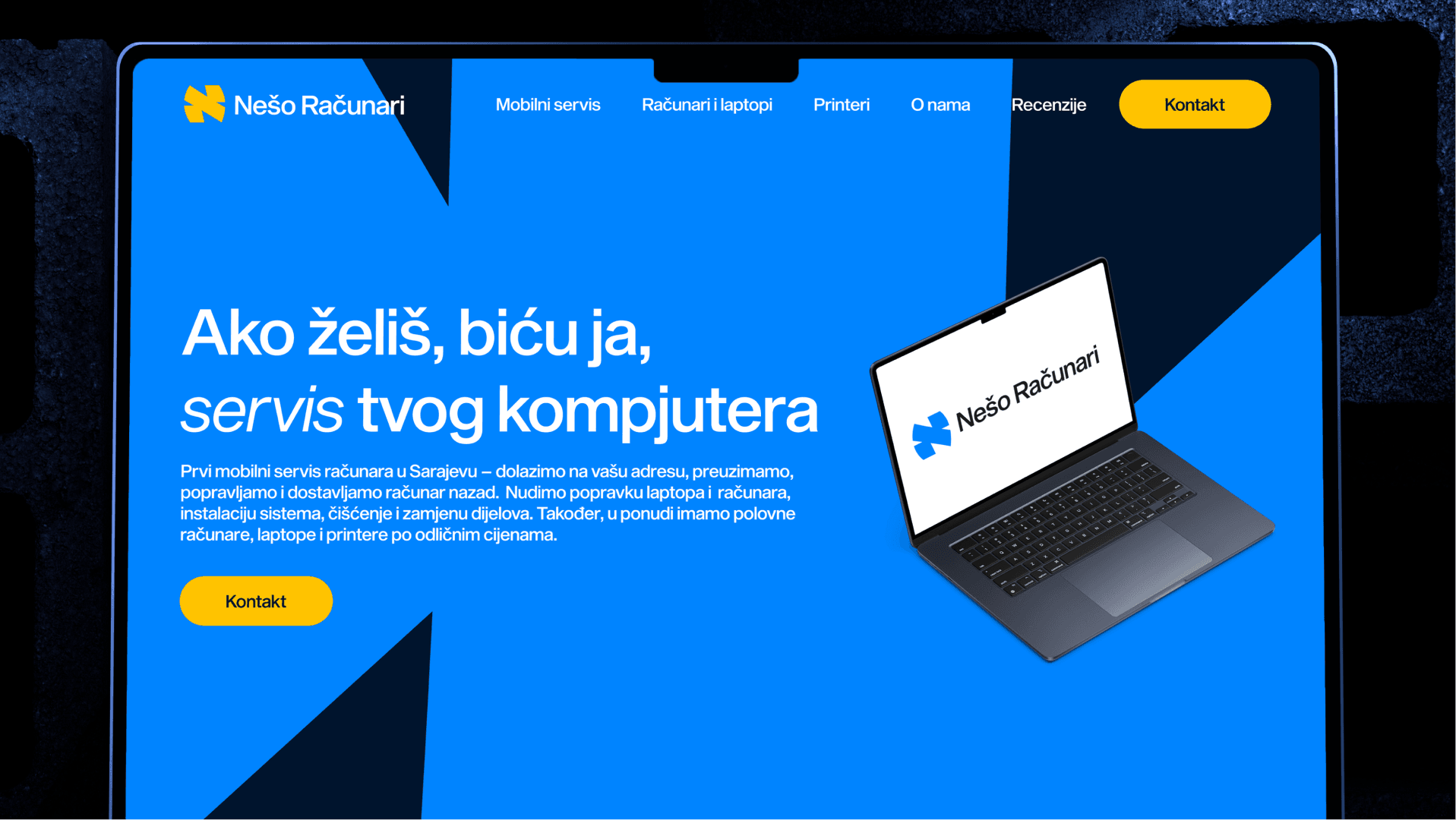 “Nešo Računari” (Neso Computers) is my father’s computer repair shop based in Sarajevo, Bosnia and Herzegovina. As a family project, I took on the challenge of building his brand entirely from scratch. Doing the research, designing the logo, crafting the visual identity, writing the copy, developing the website, and managing the online advertising. The goal was to create a bold and modern digital presence that reflected both his expertise and build trust at first glance.
